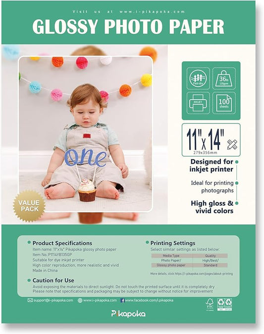 36lb Glossy Photo Paper, 11x14, 11R Size, Thin Glossy Photo Paper for Chip Bags, Inkjet, 100 Pack