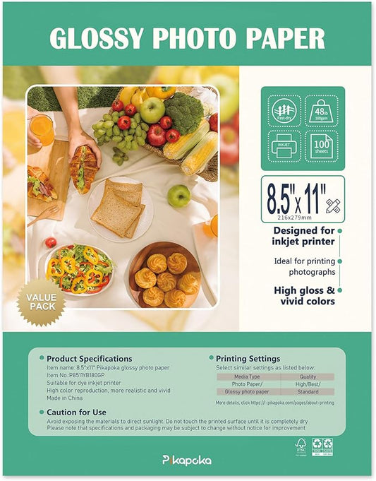 Glossy Photo Paper 8.5x11 48lb, 100 Pack, US Letter Size, for Inkjet Printer, 180 gsm