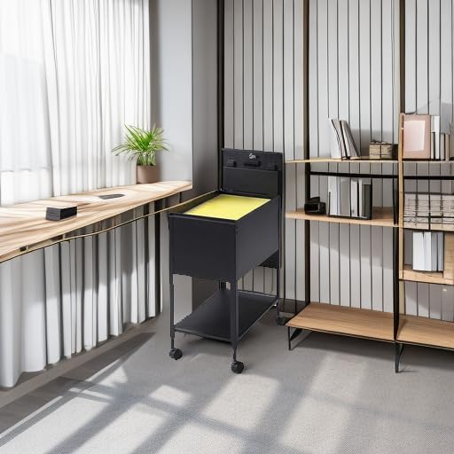 - Design features a sliding cover, keylock to secure files, piano-hinge top and shelf storage on bottom