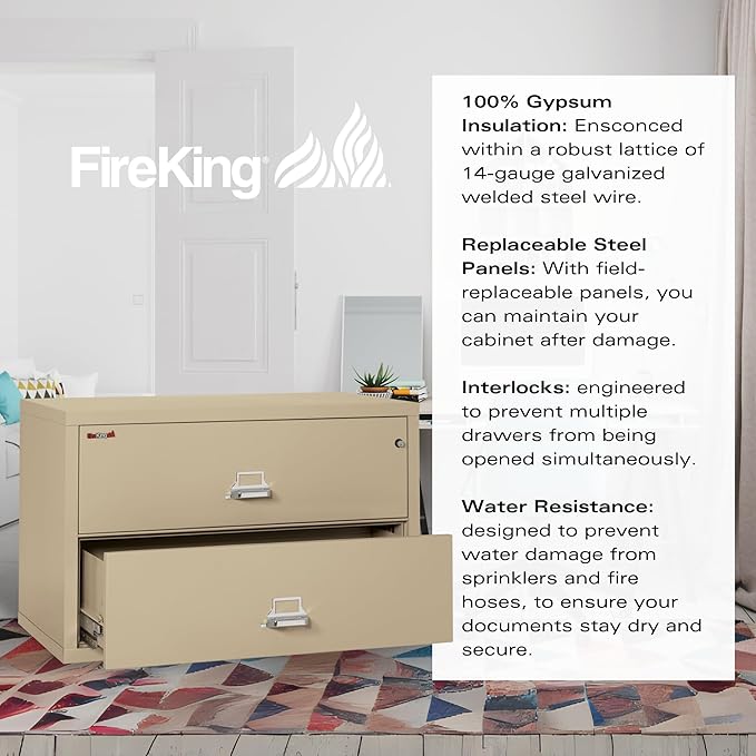 FireKing Fireproof Lateral File Cabinet (2 Drawers, Impact Resistant, Water Resistant), 27.75" H x 44.5" W x 22.13" D, Parchment
