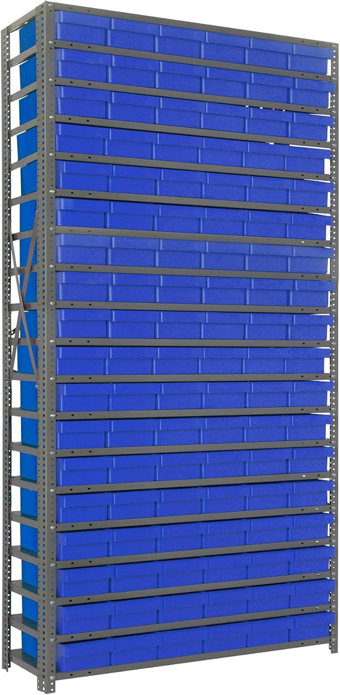 Quantum 1275-401BL Heavy Duty Shelving Unit with (19) Shelves and (27) QED401 Blue Bins for Garage Warehouse Storage Distribution | 400 lb Load Capacity | 12"D x 36"L x 75"H, Galvanized Carbon Steel