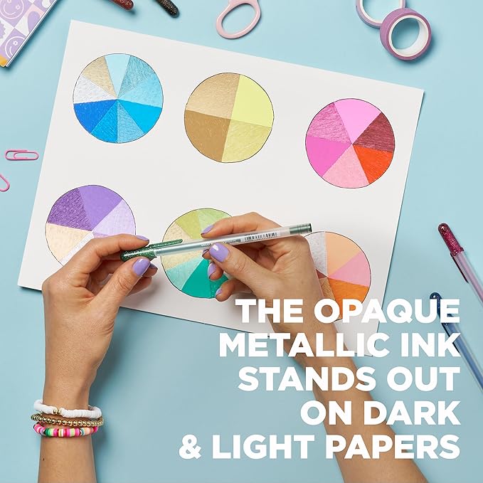 - Metallic, Opaque Colored Ink: Gel pens have metallic colored ink that flows creamy smooth onto dark and light paper