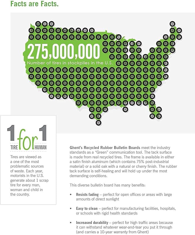 - GO GREEN: With the Ghent Enclosed Bulletin Board. This bulletin board tack surface is made from 90% post-industrial recycled rubber and the satin aluminum frame made from 75% post-industrial material