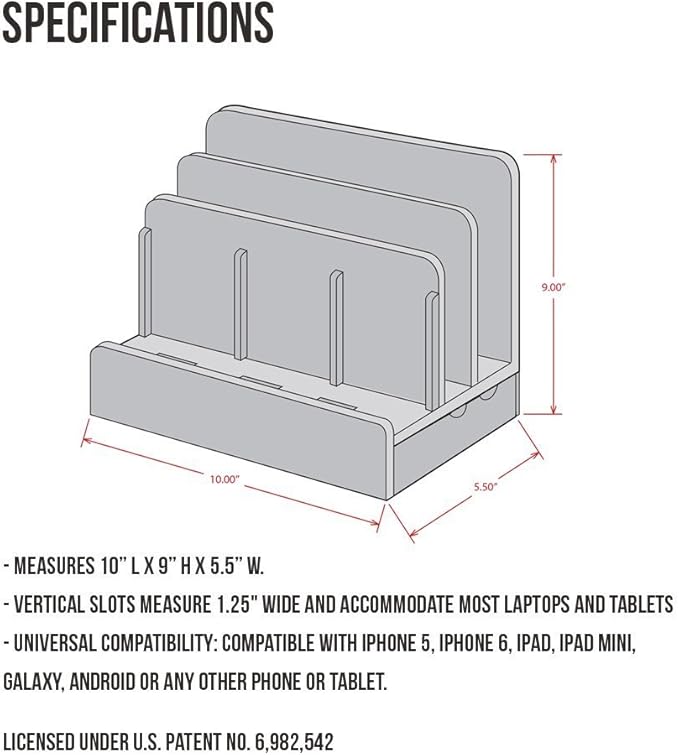 - DIMENSIONS -- Measures 10" L x 9" H x 5.5" W. The bottom tray internal dimensions (approx) are 9.5" L x 1.50" H x 4.75" W. The vertical slots measure 1.25" wide and accommodate most laptops and tablets. Universal compatibility with all consumer grade cell phones, tablets/e-readers, and laptops (up to 1.25" thick).