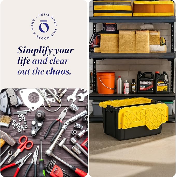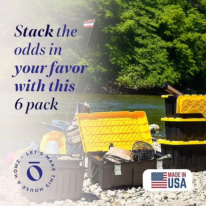 HOMZ 6-Pack Durabilt Tote, Heavy Duty Plastic Storage Bins with Lids, 15 Gallon, Black/Yellow - Stackable Organizing Containers for Home, Garage, and Office