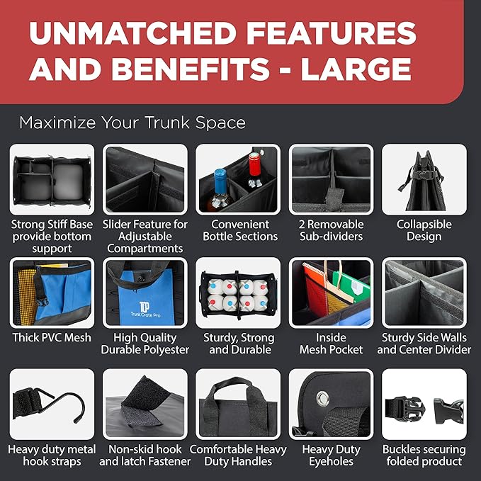 - INNOVATIVE DESIGN AND MULTI-FACETED DESIGN - The cargo storage organizer was designed and invented after months of testing and sampling with the best factories. It combines all the strengths and addresses the shortcomings of existing trunk organizers. It has the most pockets, 3 compartments, removable sub-dividers, can be folded half-length as a seat organizer, light weight yet unbreakable. Our tote is fully-collapsible for easy storage, and is designed to prevent your cargo from sliding