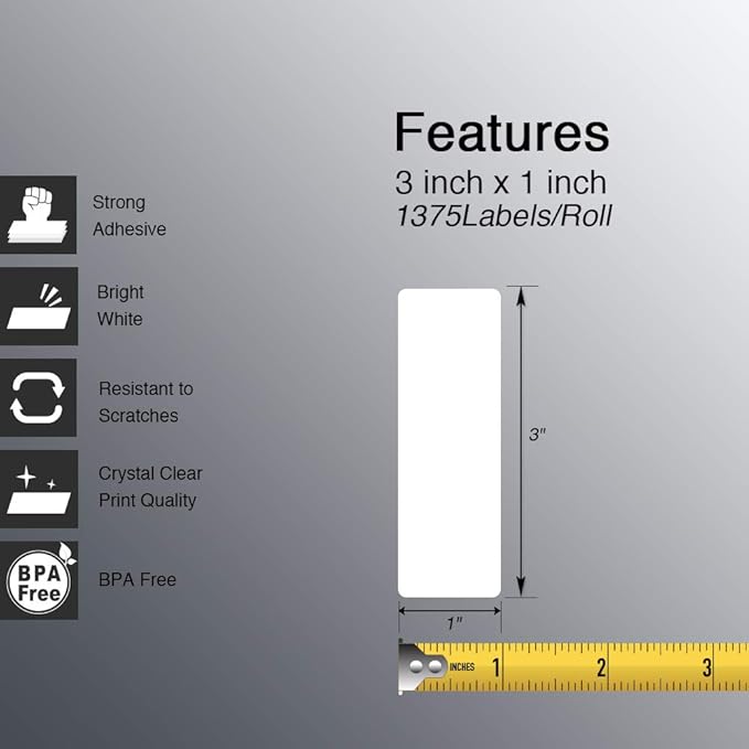 - [ Specifications ]: 3 in x 1 in (76 mm x 25 mm) (1375 Labels/Roll, 1 Roll),Paper tube diameter:1"(25.4mm). No Ink Toner or Ribbons Needed! Save your money and effort.