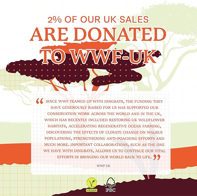 - SUSTAINABLY SOURCED, ENVIRONMENTALLY CONSCIOUS: Made from recyclable materials and FSC certified paper, our notebooks are Vegan Certified. Dingbats* Notebooks Ltd donates 2% of UK sales to WWF-UK, supporting environmental conservation.
