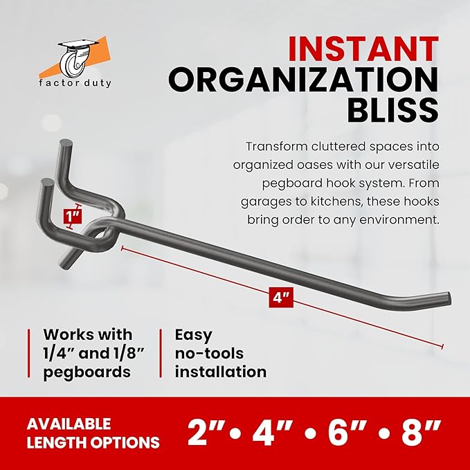 - EASY TO INSTALL AND REMOVE: Corrosion resistant. Our hooks fit all types of 1/4" & 1/8" pegboards with 1" spacing and hook directly into the mounted board, easy to install, use and move.