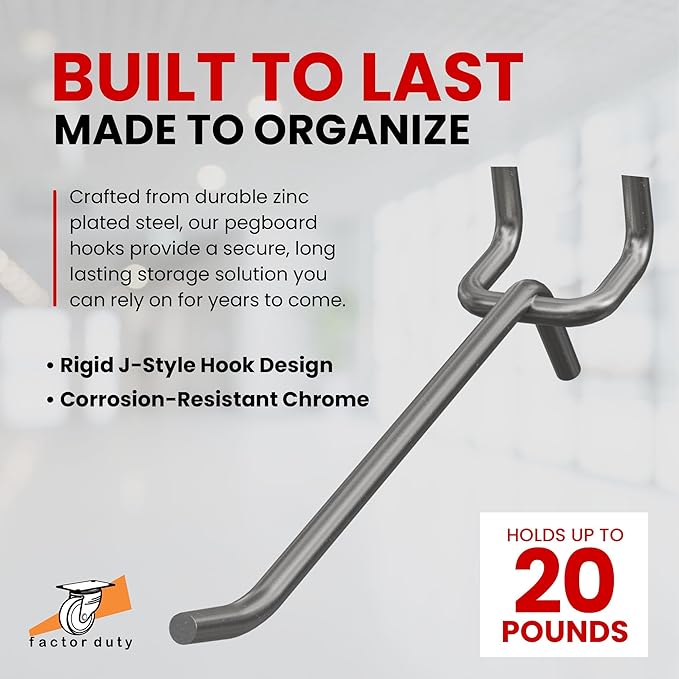 - PREMIUM QUALITY: Our peg hooks are made of high quality steel that allows years of use without bending or deforming, and plated with Zinc that ensures rust-resistant and extra durability.