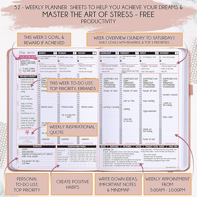 - INCREASE PRODUCTIVITY AND HAPPINESS - This is a deluxe life goal planner showing you how to become the best possible version of yourself on a mental, physical & interpersonal level using the law of attraction vibration guide. This planner is a daily planner, monthly planner, weekly planner, productivity planner, goal planner, business planner, to do list planner, planner notebook & gratitude journal all-in-one.