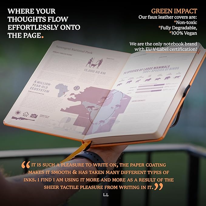 - A5 NOTEBOOK WITH LOTS O' FEATURES: Dingbats notebooks ooze quality - this hardcover bound leather notebook is crafted with PU vegan leather, micro-perforated cream 100gsm pages, an elastic closure and pen holder. It's complete with a silhouette of the Safari, an infographic spread about the endangered region in the endsheets and an inner pocket for a little added detail - the perfect gifts for men and women, these travel essentials are a gift that keep on giving
