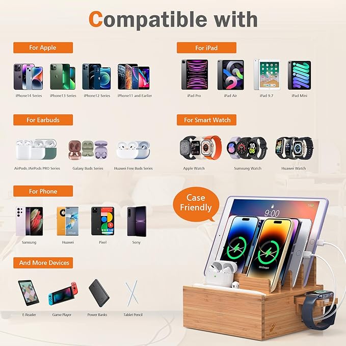- Multi devices Charging Station: Pezin & Hulin bamboo charging station stand can hold up to 8 electronic devices such as cell phone, tablet, watch etc. Maintaining your devices in order and helps to clean up the stacking device charging
