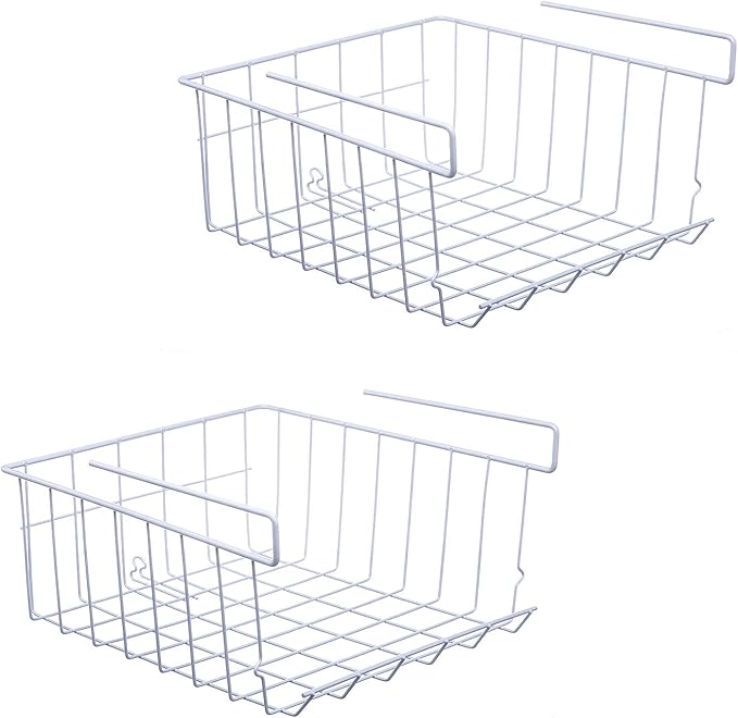 Under Shelf Storage Basket, 2-Pack Under Shelf Hanging Metal Wire Storage Basket Organizer for Kitchen, Office, Pantry, Bathroom, Cabinet, White