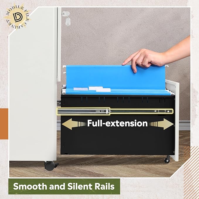 - Multi-functional Casters:This mobile filing cabinet moves smoothly on 5 casters, suitable for hardwood and carpet. 2 front locking casters for stability, a center caster prevents tipping. 360° swivel for easy maneuvering.