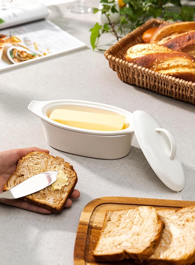 - No More Hard Butter- Butter stores in the refrigerator is too hard to spread, while left on the counter will melt. This porcelain butter keeper is great to keep your butter at room temperature for 2 weeks. You can have room temperature butter ready at all times for toast and sandwiches and don't worry about spoilage.