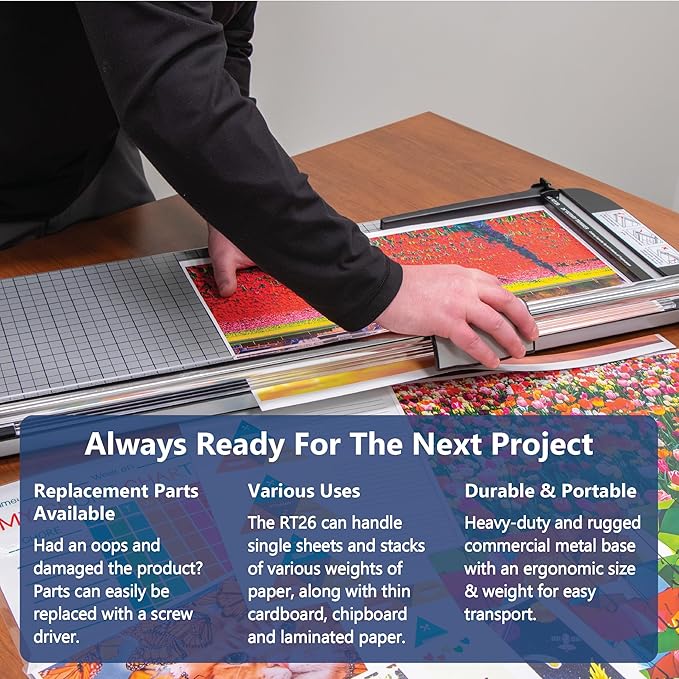 - VERSATILE TRIMMER: Rotary cutter accurately trims sheets up to 26” long and up to 15 sheets at a time. This heavy duty paper cutter delivers professional cuts and is perfect for classrooms, offices, photography, scrapbooking and more.