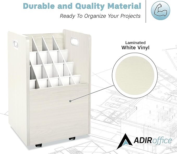 - Stylish and functional: The Adir’s plans organizer combines aesthetic appeal with practical design. Its sleek vinyl laminate finish complements any decor. With a 50-pound weight capacity and sturdy construction, this rolled document storage is built to last.