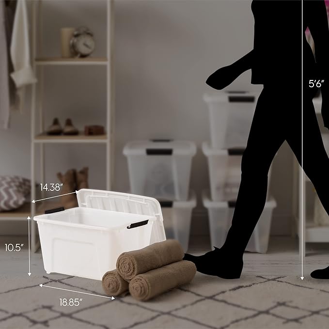 IRIS USA 32 Qt Stackable Plastic Storage Bins with Lids, 6 Pack - BPA-Free, Made in USA - Discreet Organizing Solution, Latches, Durable Nestable Containers, Secure Pull Handle - Pearl