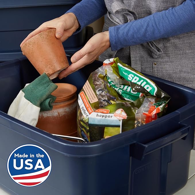 Rubbermaid Roughneck Tote 10 Gal, 8 Pack, Made in USA, Dark Indigo Metallic, Rugged Plastic Stackable Storage Bins with Lids and Handles
