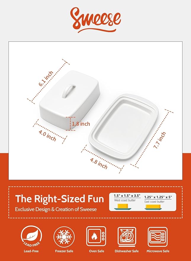 - Elegant & Minimalist Style - The Sweese butter dish adopts a recessed design that fits perfectly with the lid, which can effectively prevent dust and debris from entering, effectively protecting the cleanliness and freshness of the butter. The butter keeper is clean, pure, and has a smooth and shiny appearance making it look very high-end and fitting perfectly with any decoration style.