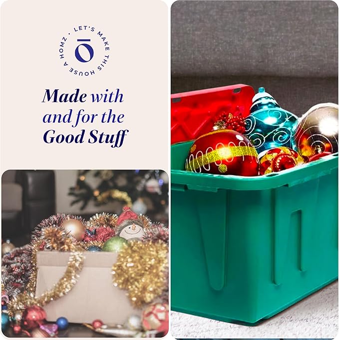 HOMZ 2-Pack Durabilt, Heavy Duty Plastic Storage Bins with Lids, 27 Gallon, Green/Red - Stackable Container Boxes for Holiday, Attic, and Garage Organization
