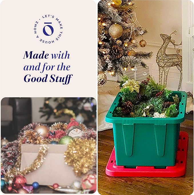 HOMZ 2-Pack Durabilt, Heavy Duty Plastic Storage Bins with Lids, 15 Gallon, Green/Red - Stackable Container Boxes for Holiday, Attic, and Garage Organization