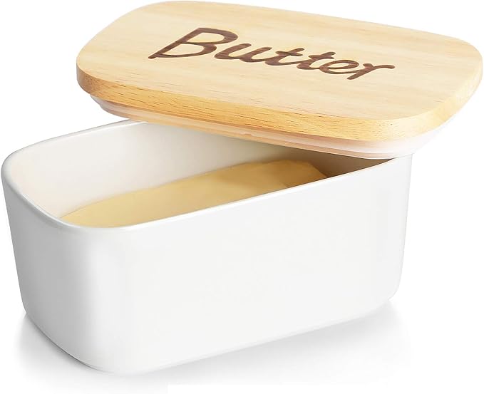 GDCZ Ceramics Butter Dish with Wooden Lid- Large Covered Butter Holder for Countertop, Butter Keeper Container Perfect for Holds 2X 4oz West/East Coast Butter, White