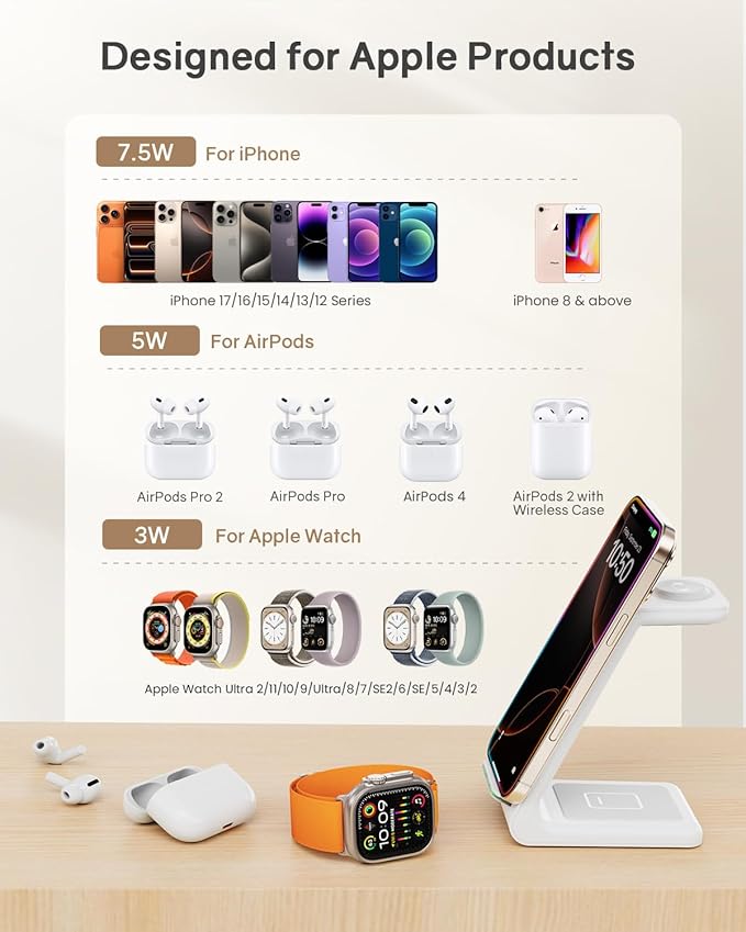 - Multi Charger Station for Clutter-Free: CIYOYO 3 in 1 wireless charging station keeps your phone, watch and earbuds charged simultaneously while making your desktop or nightstand neater. Built-in with watch charger, CIYOYO true wireless saves the hassle of inserting Apple Watch charging cable into the charging dock. It works flawlessly with iPhone 17/16/15/14/13/12/11/X/8 series, Apple Watch 11/8/7/6/5/4/3/2/SE, Air Pods Pro 3rd Generation/2nd Generation/Pro/3 (mag safe version)/2 (wireless version), and other wireless enabled devices.