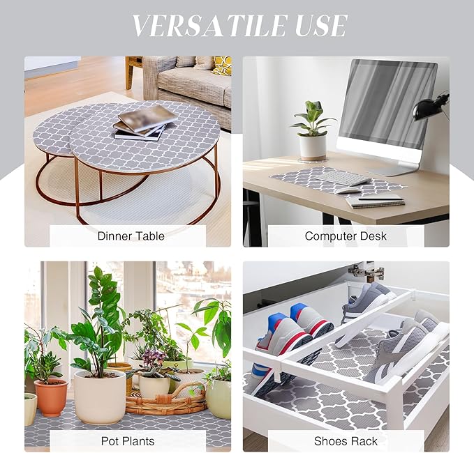 - Non Slip Shelf Liner for Storage Solution- Measures 12” x 20 ft. with a non-slip double-sided mat, the shelf liners help prevent spills in storage spaces by keeping your items locked in place and free from unwanted dirt and debris. The quatrefoil design of this wire shelf liner is not only beautiful but also effective to secure your belongings on the wire shelf, glass shelves and so on.