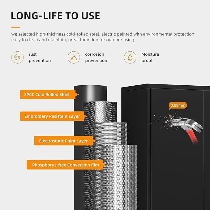 - ✅【Safe Locking System】Designed with 1 Lock and 2 keys, secure all of your items, better privacy, high safety. 2 keys for standby, if it is missing and just contact us to get replacement keys. More importantly,this garage storage cabinet is designed with protruding door handle, more convenient to grasp and easy to opening the metal office cabinet