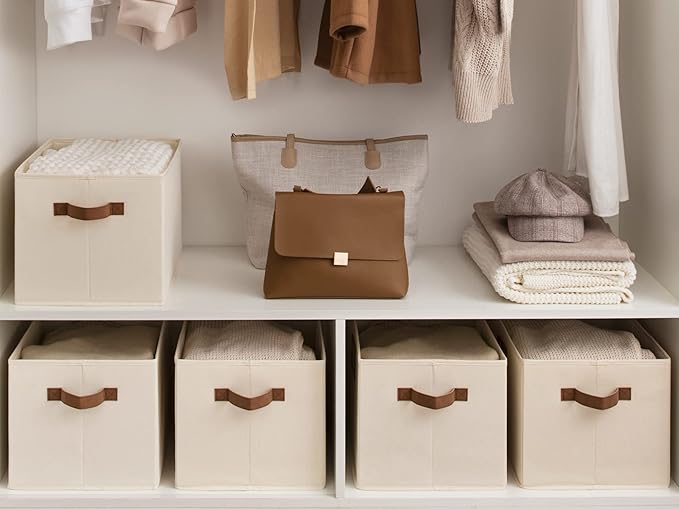 StorageWorks Storage Baskets for Shelves, Foldable Fabric Closet Storage Bins with PU Handles, Fabric Storage Bins Clothes Organizer, Ivory White, 3-Pack, Extra Large
