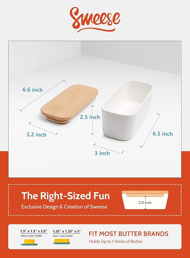 - A Perfect Match for Most Butter Brands - The measure of Sweese butter container is 6 x 3.5 x 2.7 inches, with enough width and depth, the large size butter container can easily accommodate more butter sticks and avoid making a mess in the kitchen. The butter dish with lid works perfectly for both West and East/European coast butter, suitable for most brands like Kerrygold, Land O'Lakes, Plugra Butter, and more.