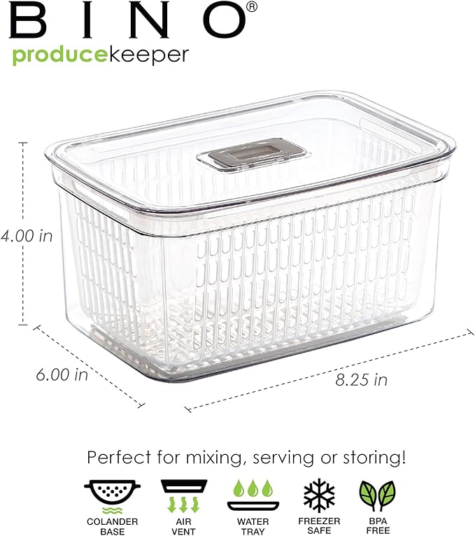 - Clever Design: The BINO produce saver is made of a durable material that is easy to clean and has a tight-fitting lid to keep out moisture and air. It has a removable colander-style basket that helps drain any excess water.