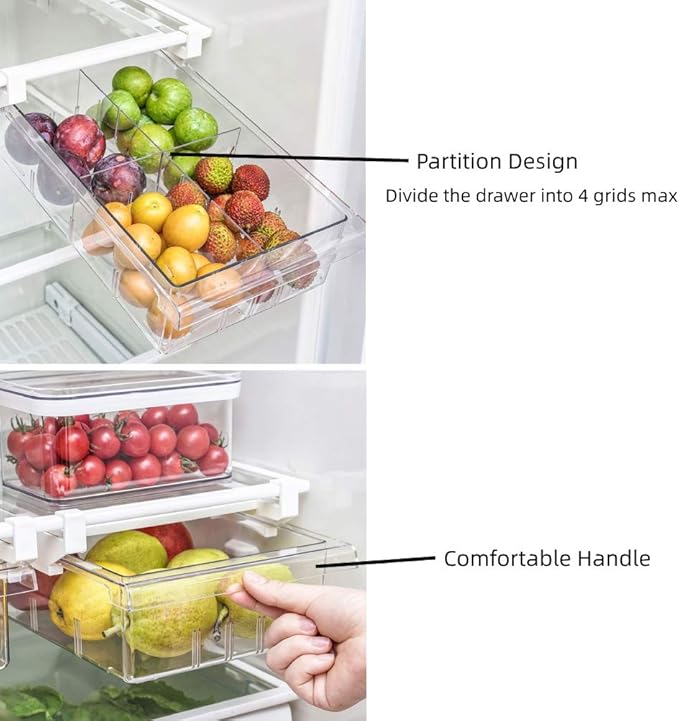 - 【PORTABLE DESIGN】Package Included: 1 Fridge Organizer and 2 drawer divider. You can choose to divide the drawer into 4 grids or 2 grids or without grids. The whole container size is 11.8" x 8" x 3.75".