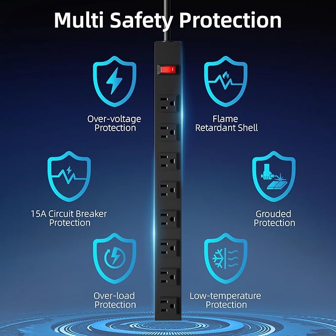- OVERLOAD PROTECTION:A power switch with lighting has a built-in high quality 15A circuit breaker for overload protection. When the operating current exceeds the rated current, this power strip automatically cuts off the power supply from spikes, fires or other unsafe conditions.