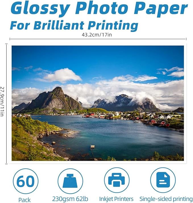 - Size: 62lb, 230gsm, 11x17 inches, Single Glossy Finish Side, 11.1mil.