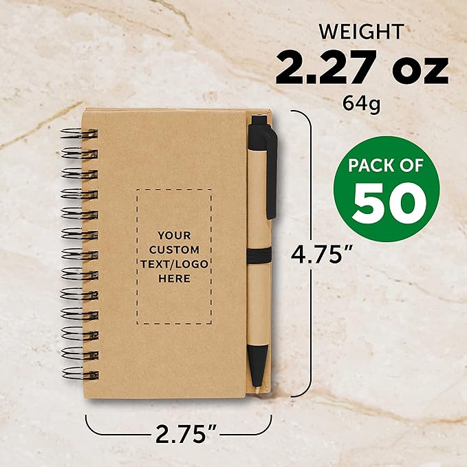 Custom Mini Spiral Notebooks with Black Ink Pens Set of 50, Personalized Bulk Pack - Perfect for School, Office, Business, Home - Black