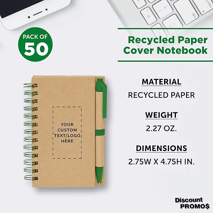 Custom Mini Spiral Notebooks with Black Ink Pens Set of 50, Personalized Bulk Pack - Perfect for School, Office, Business, Home - Green