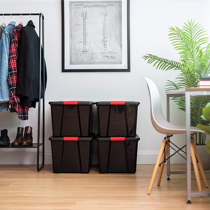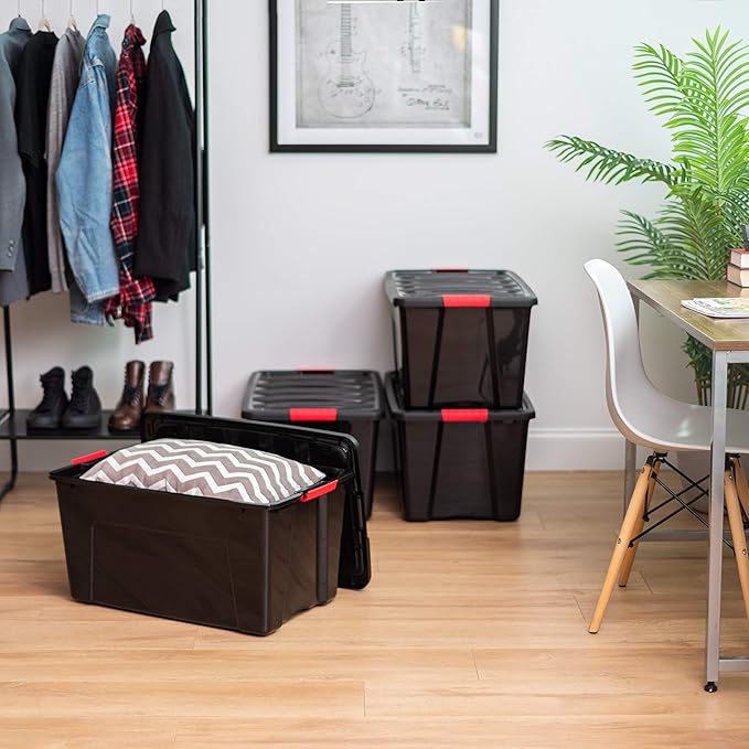 IRIS USA 72 QT Plastic Storage Box with Lid and Latches - 4 Pack - BPA-Free, Garage Organizing Solution, Durable Nestable Stackable Containers, Secure Pull Handle - Black