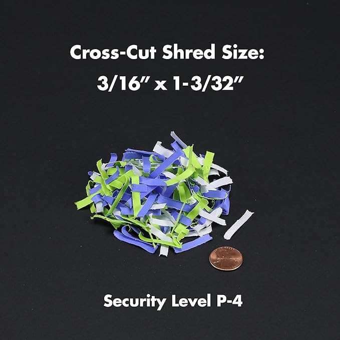 - Shreds paper, CDs, DVDs, credit cards into small pieces (3/16 by 1-3/32 inches), security level P-4.