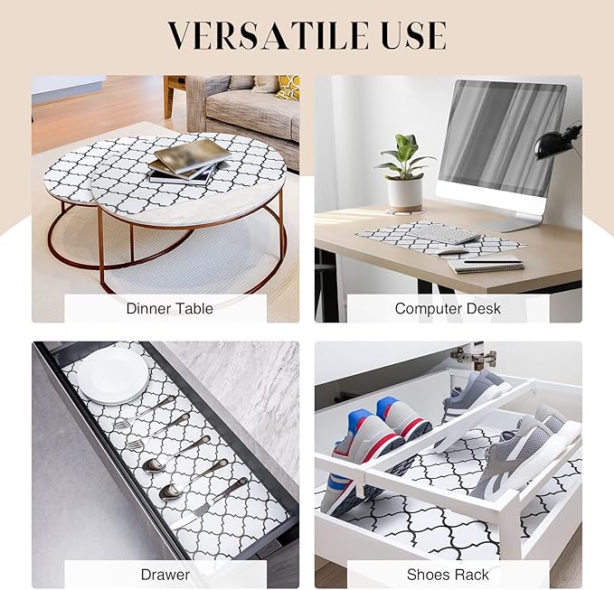 - Perfect Storage Solution- These black and white kitchen shelf liners come in 17.5" x 30 ft. Made of eco-friendly EVA material and feature a non-slip design, the cabinet liners help prevent spillage by keeping your items locked into place and free from unwanted dirt and debris. The plastic clear liners are ideal for use in a top drawer, bedroom dresser, bathroom cabinets, kitchen cabinets and desk drawers for organizing and protecting small items from damage or scratches.