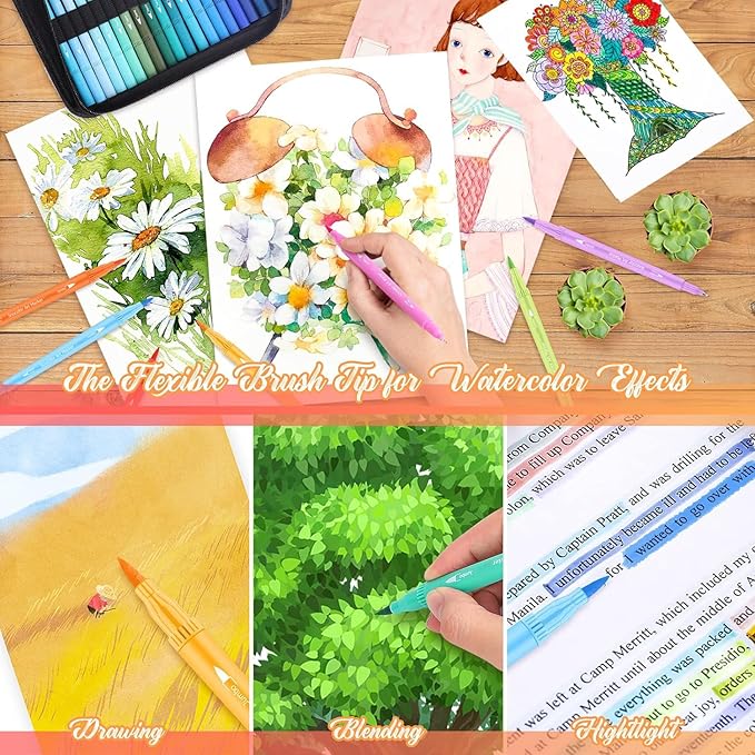 - EASY TO CARRYING AND USE: These are all in a beautiful zipper pencil case, reusable, portable, and durable. the pencil case also has a small handle for you to carry out. Vibrant no bleed watercolor Markers bring water-based ink with our brush calligraphy pens, it will give consistent lines for detailing fine art and brush lettering.