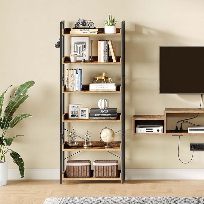 Rolanstar Bookshelf 6 Tier with 4 Hooks, Industrial Wood Bookcase, Vintage Storage Rack with Open Shelves, Rustic Standing Bookshelves Metal Frame Display Rack for Living Room, Bedroom, Rustic Brown