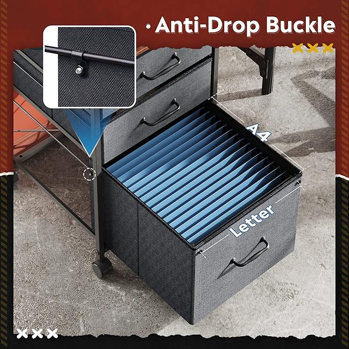 - Easy to Move: Rolling on 4 wheels, this mobile file cabinet can fix or move around your home office freely. Built-in brakes on front 2 casters to keep it in position and add stability. Unique fabric drawer design makes it only weigh 22 lbs. and light to move.