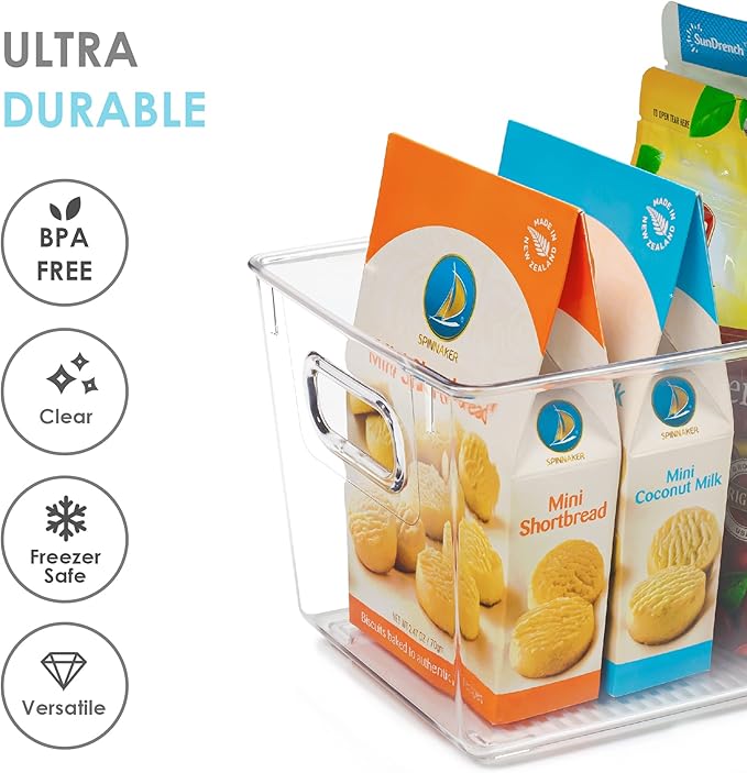 - Functional and Versatile ---- With the perfect size, these plastic storage bins are great for cabinets and deep pantry shelves as well as inside the fridge or freezer. You can use them in any room of the home, such as in kitchen, pantry, closet, craft rooms, laundry rooms, bedrooms, bathrooms, kitchens, offices, garages, toy room, playroom and more.
