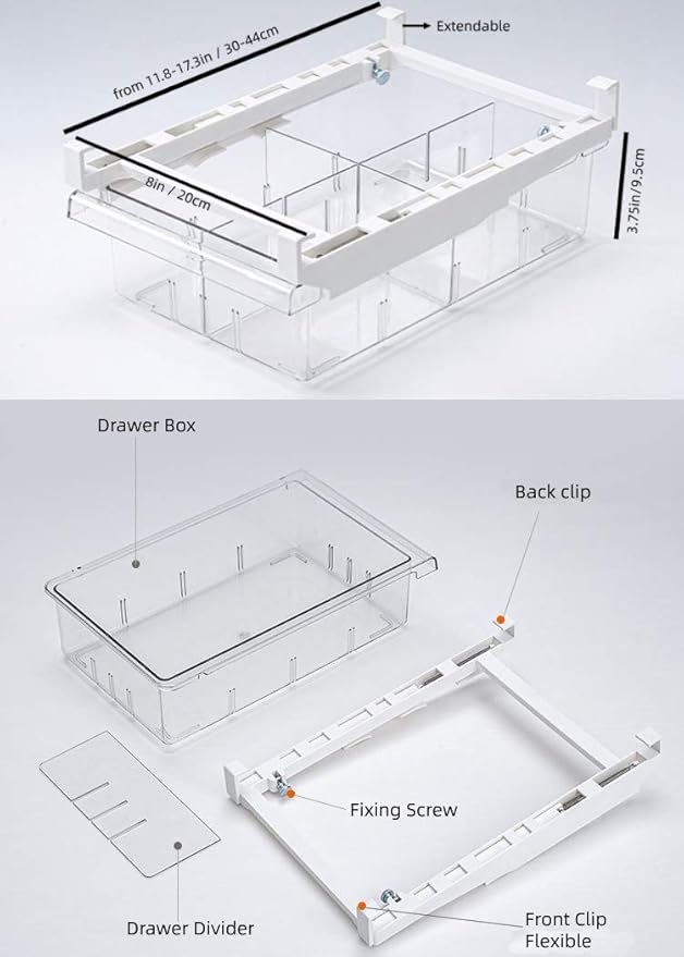 - 【EXTENDABLE】Rails extend from 11.2 inches to 18 inches long, Smooth glide track design make sure the drawer opens and closes easily. Fits most standard size refrigerator shelves, please measure shelf dimensions for proper fitment. No tools required.