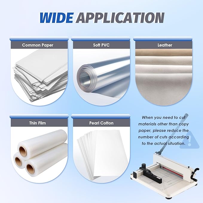 - Wide Application: It is suitable for people who deal with hundreds of sheets of paper, and besides of paper, it can also cut soft PVC, leather, non-woven fabric, bubble film, fabric pearl cotton and etc, is a very powerful paper cutter.