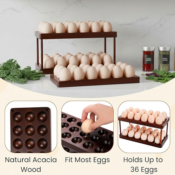 YOUEON Acacia Wooden Egg Holder with Double Layers, Detachable Wooden Egg Tray Holds 36 Fresh Eggs, Countertop Storage Rack for Gathering Fresh & Easter Eggs, Rustic Decor