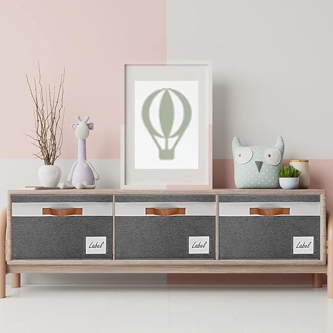 - 【LARGE STORAGE BINS WITH LIDS】Set of 3, dimensions (each): 15(L) x 11(W) x 9.7(H) inch, storage capacity of the extra large storage bins with lids are 26L, which can hold a large number of items to organize your home or office. Each fabric storage baskets with Lids has a eye-catching label to classify the stored items. The perfect size and neutral colors of the storage bins with lids match most of your home decorations and styles while keeping your home organized